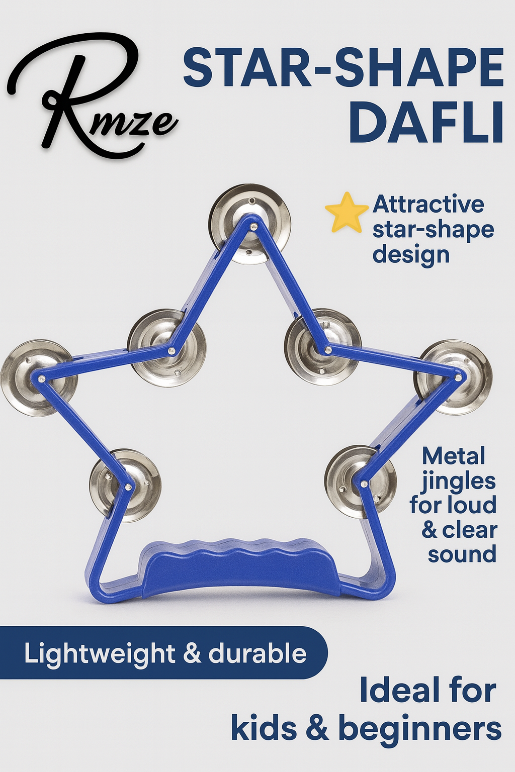 Rmze Star-Shape Dafli (Tambourine) is a fun and eye-catching percussion instrument designed to deliver a bright, loud, and clear rhythmic sound. Its unique star-shaped metal frame with premium steel jingles produces crisp sound while also attracting kids and beginners.