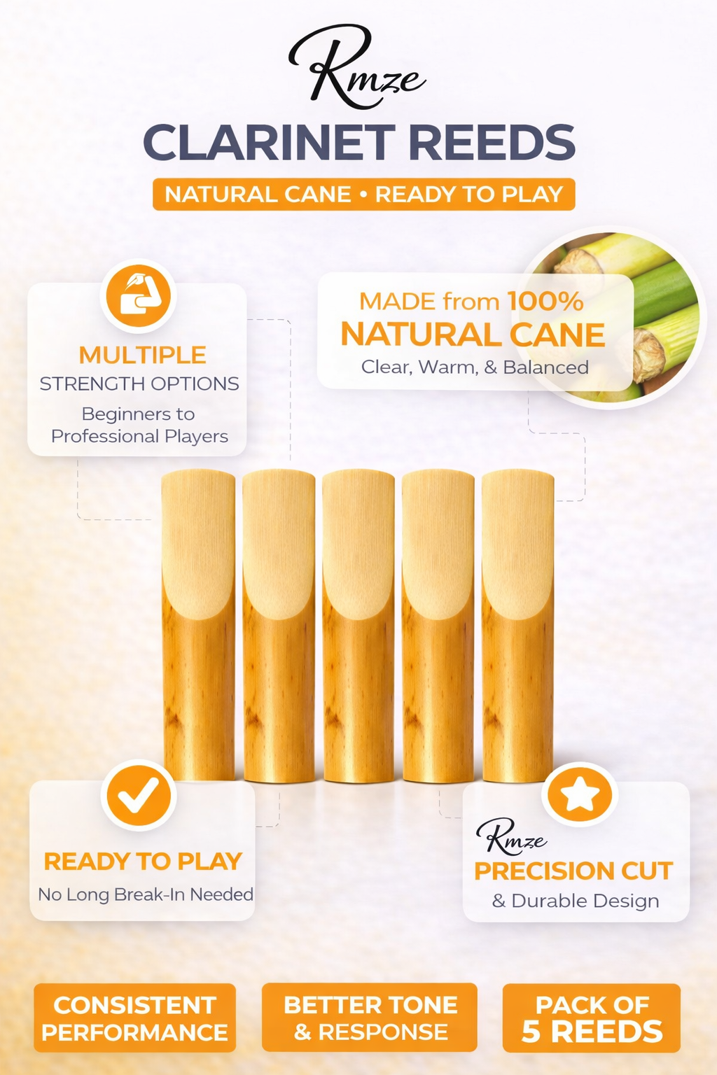 Precision cut aur balanced design ki wajah se yeh reeds beginners, students aur professional clarinet players ke liye perfect choice hain. Ready to play feature ke saath, reeds ko zyada break-in time nahi lagta — first note se hi stable response milta hai.
