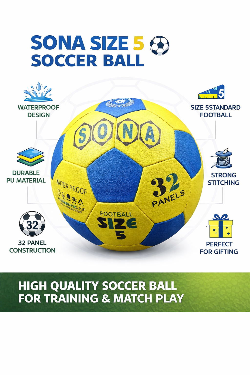 Manufactured with premium quality PU material, the football offers a soft yet sturdy outer surface that ensures safe play while maintaining excellent grip and control. The 32-panel stitched construction provides superior shape retention, balanced bounce, and reliable flight, even after extended use.